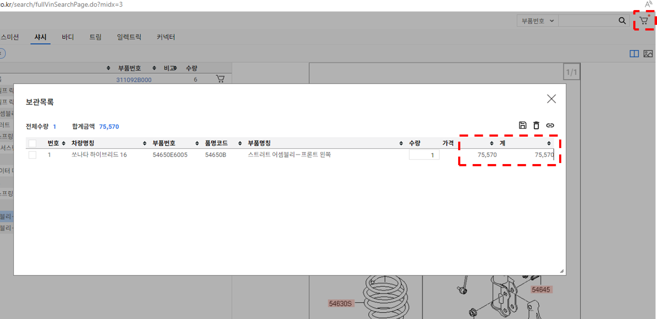 2. 우측 상단에 장바구니 버튼을 클릭하면 부품 명칭과 금액 확인이 가능하다.