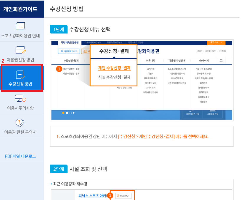 스포츠 강좌 이용권 홈페이지에 방문하여 아래와 같은 방법으로 본인이 원하는 강좌를 조회하여 신청하면 완료됩니다.