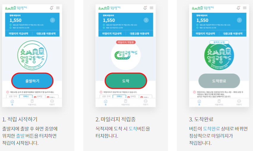 카드 신청 및 앱에 등록까지 완료하였다면 마일리지 적립이 가능합니다. 마일리지 적립은 출발할 때 시작을 해야 하며 도착 후 도착 완료 버튼을 눌러야 정상적으로 적립이 됩니다. 또한, 실내에서 하면 안 되고 반드시 실외에서 출발하기 버튼을 눌러야 GPS가 정상적으로 인식이 됩니다.