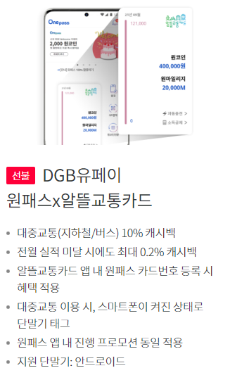 원패스 앱에서 발급된 교통카드를 알뜰교통카드 앱에 등록해야 사용이 가능합니다. 원패스 역시 안드로이드 스마트폰에서만 이용이 가능하며, 원패스앱과 알뜰교통카드 앱을 동시에 이용해야 마일리지 혜택이 지급됩니다. 혜택 받은 마일리지는 매월 초 3 영업일에 지급이 됩니다.