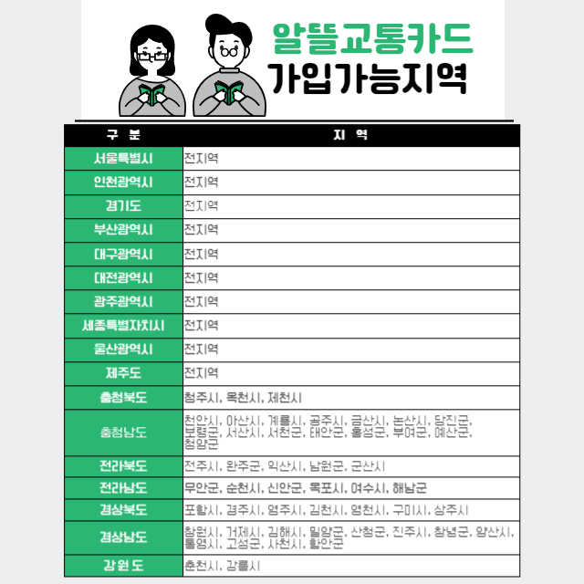 알뜰교통카드는 전국에서 사용이 가능하지만, 가입은 주소지에 제한을 두고 있습니다. 가입 가능한 지역은 하기 표를 참고 바랍니다.