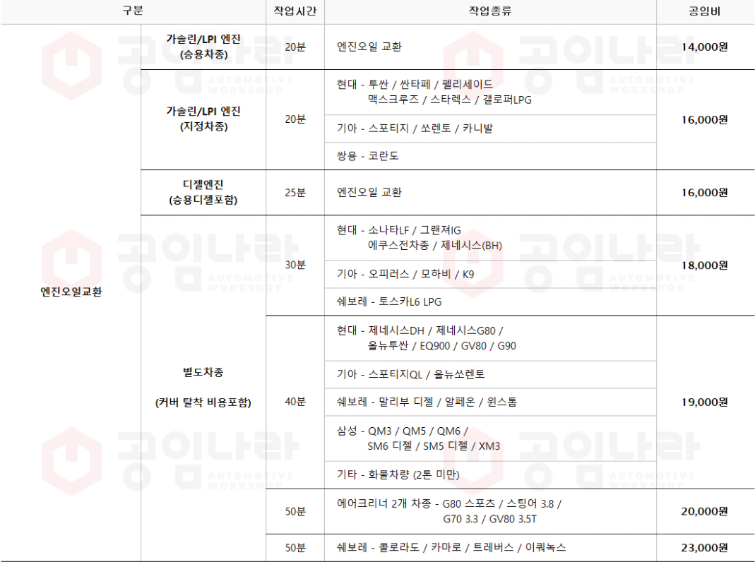 본인이 원하는 엔진오일과 필터를 구입해서 가면 말그대로 공임비만 결제하면 교환 할 수있는 곳입니다.