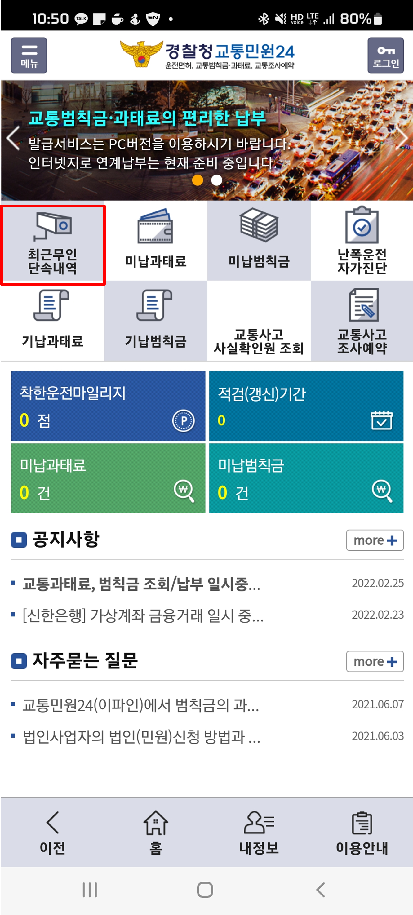 3. 로그인 후 최근 무인단속 내역을 클릭한다.