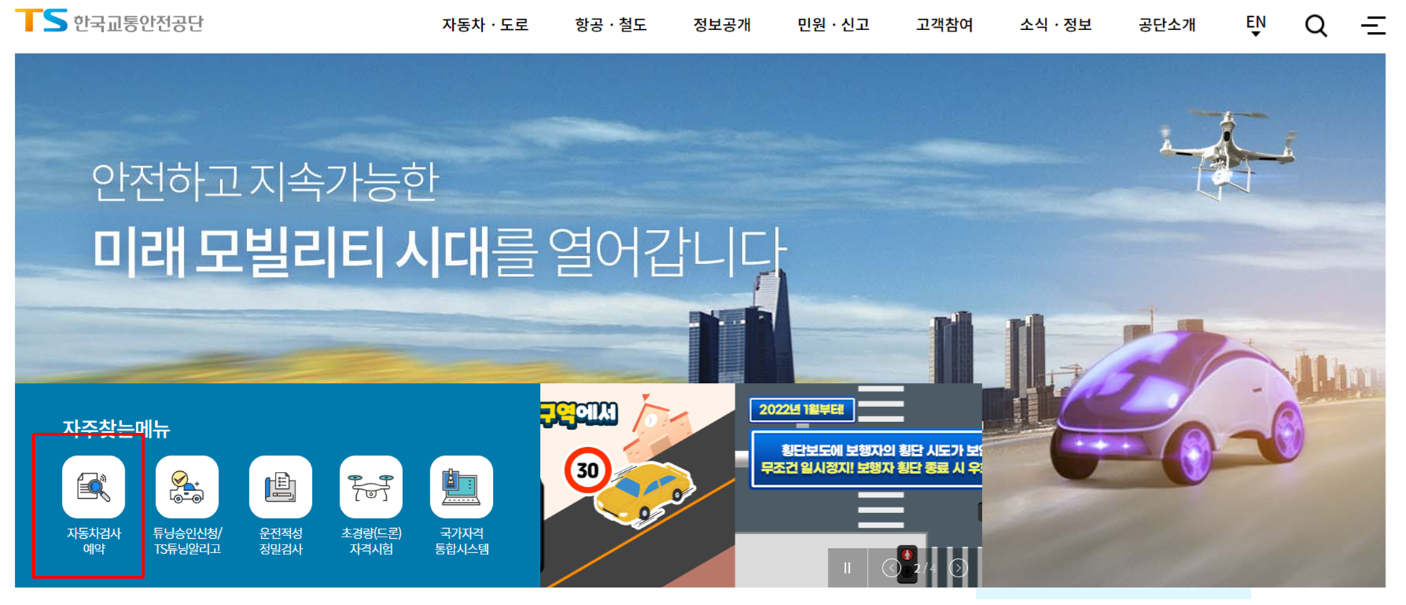 2. 홈페이지내 자동차 검사 예약을 클릭한다.