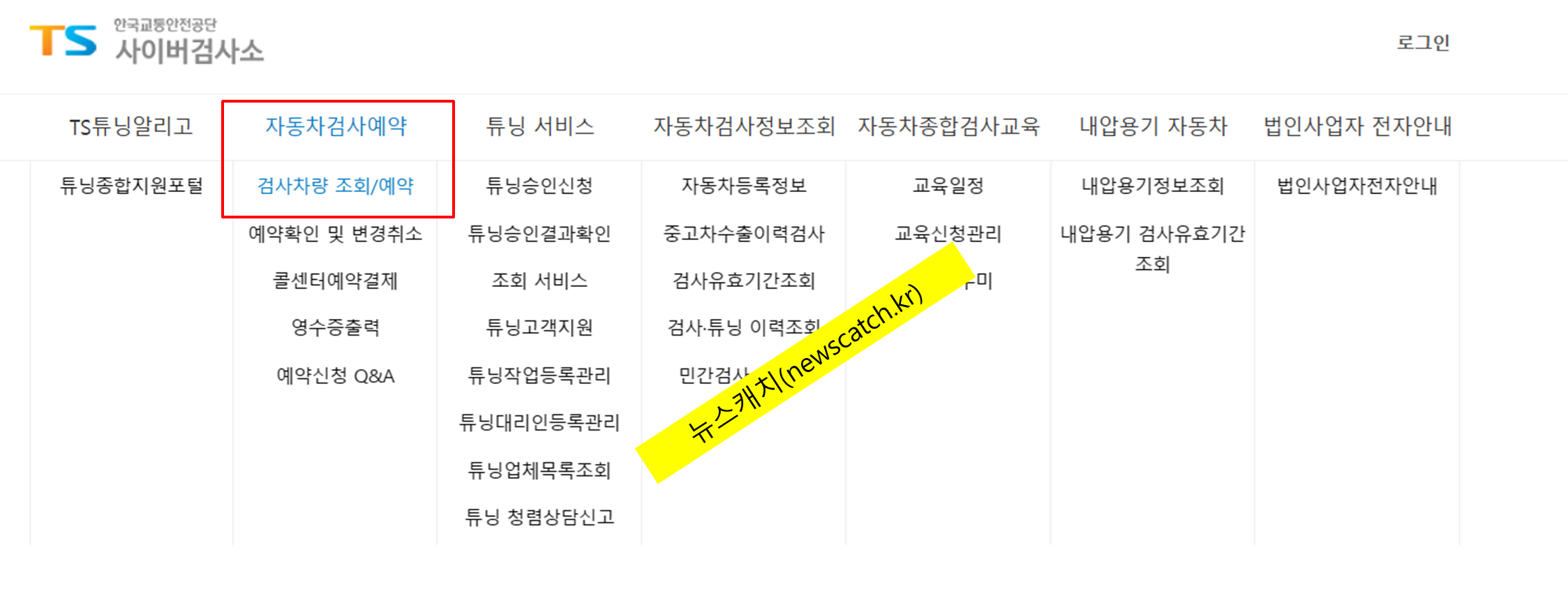 홈페이지 방문 후 상단에 자동차검사예약 탭을 누르시고 검사차량조회/예약 클릭을 합니다.