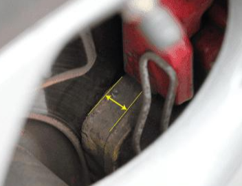 휠 사이에 브레이크 패드가 눈으로 확인 가능합니다. 그 때 패드 두께를 확인하여 많이 닳아 있으면 교환을 추천드리며 통상적으로 10만km정도에 교환을 실시합니다.