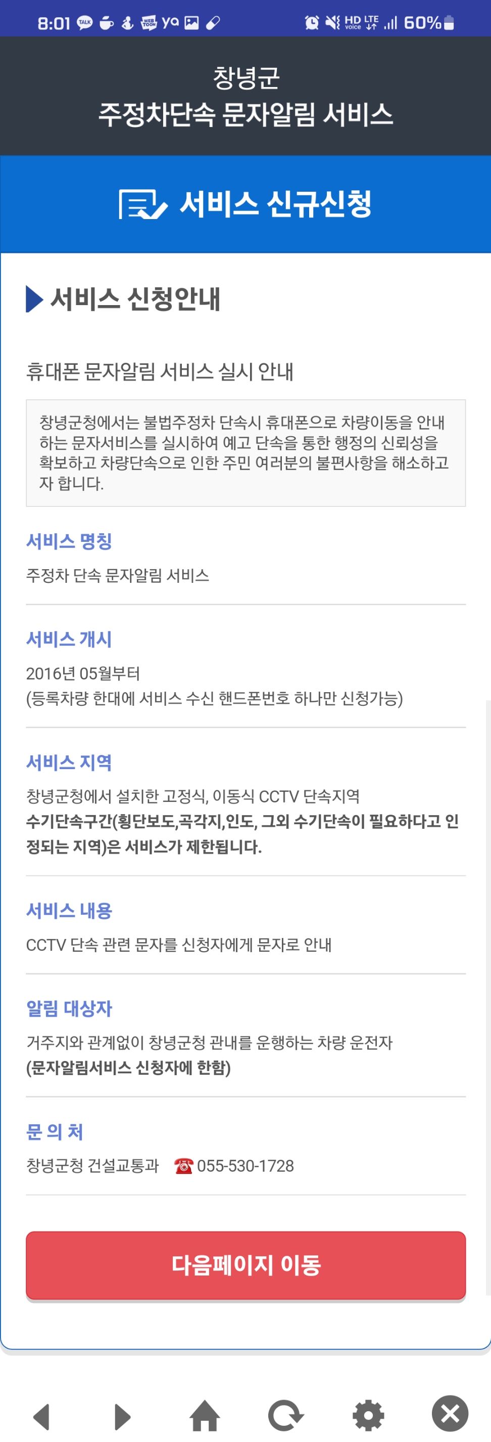 불법 주정차 지역의 차량에 대한 CCTV의 단속내용이 신청한 사람에게 불법 주정차 안내 메시지를 발송하여 차량의 이동을 유도하여 주정차 질서를 확립하는 서비스입니다.