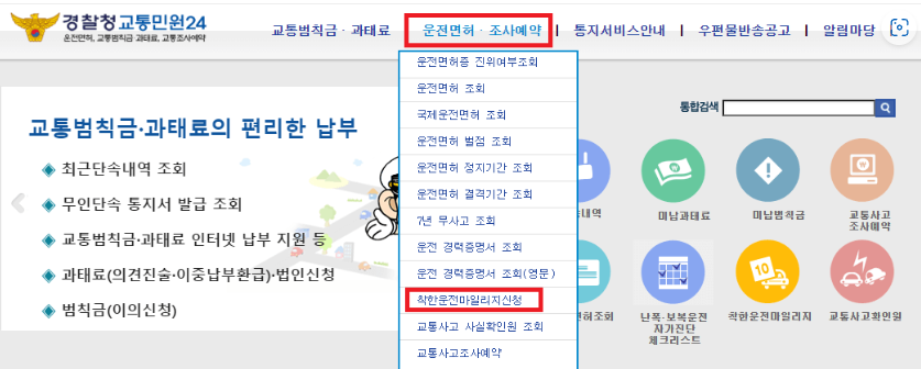 3. 로그인을 하시고 홈화면 상단에 운전면허 및 조사예약이라는 탭이 보이실 겁니다. 그 탭을 누르시고 착한운전마일리지 신청을 클릭하시면 됩니다.