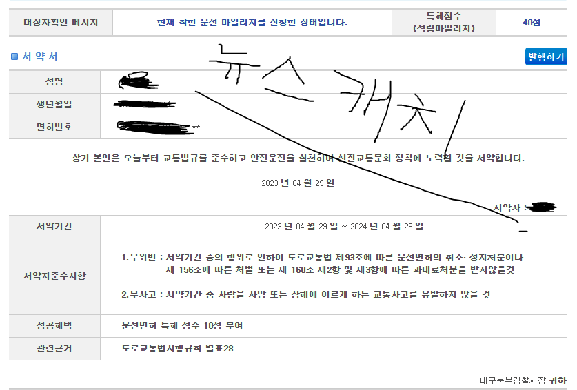 4. 신청이 완료되면 아래와 같은 화면이 보이실겁니다. 본인의 경우 이미 40점이라는 마일리지가 쌓여있고 차후 벌점 발생시 해당 마일리지로 제출하면 감경이 됩니다.