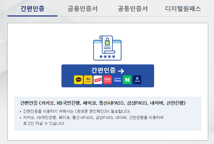 2. 회원가입을 하시거나 본인이 편한 방법으로 로그인하시면 됩니다. 보통 간편인증이 사용이 편해서 많이들 사용하시는 방법입니다.