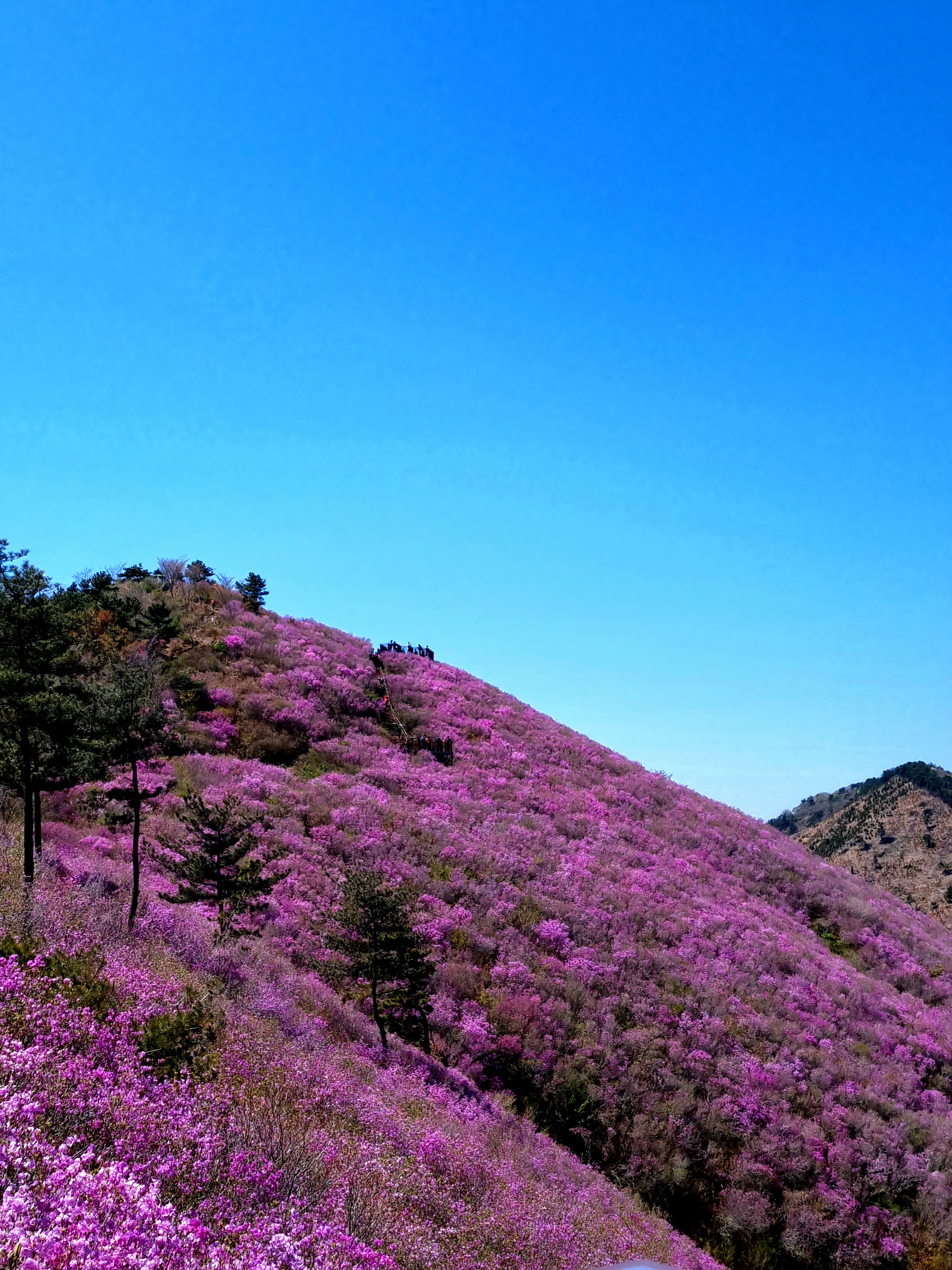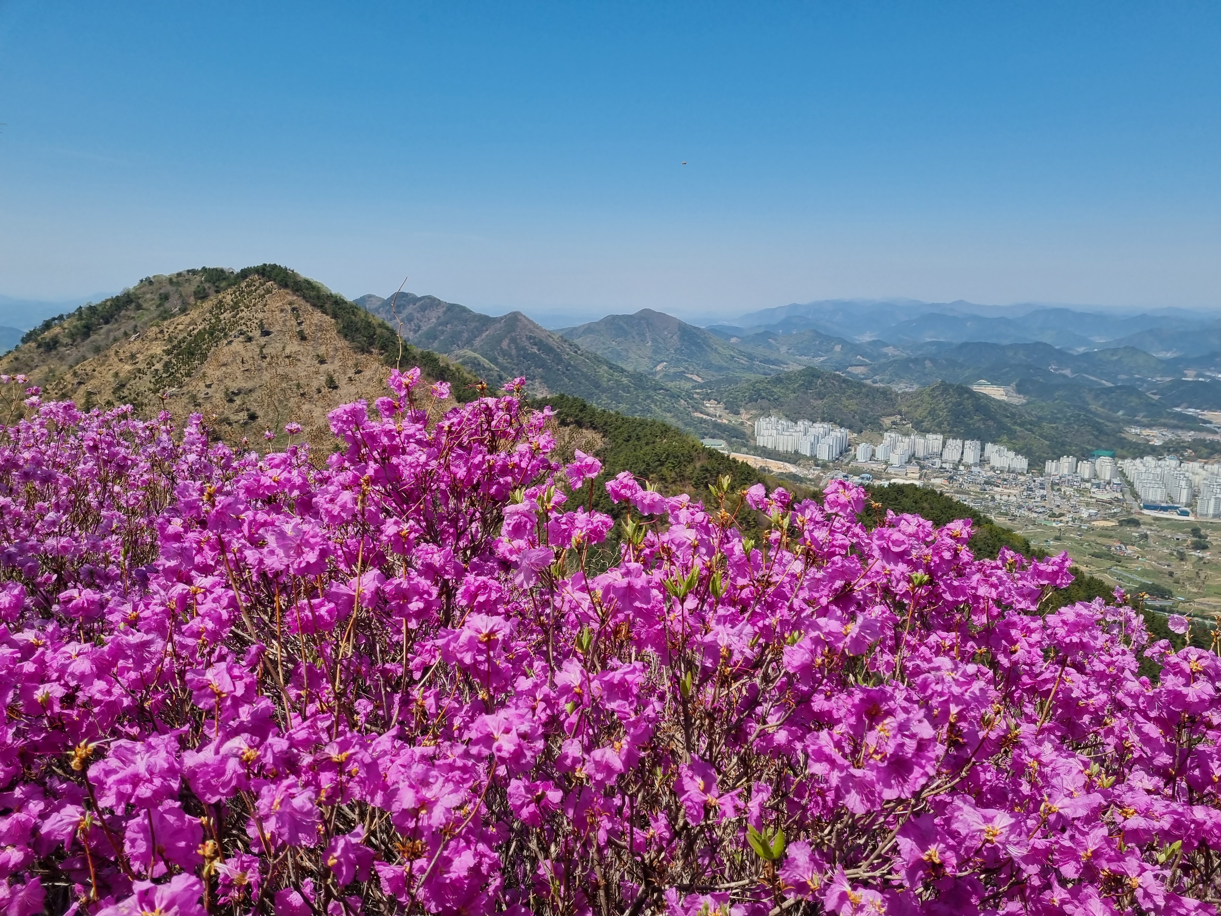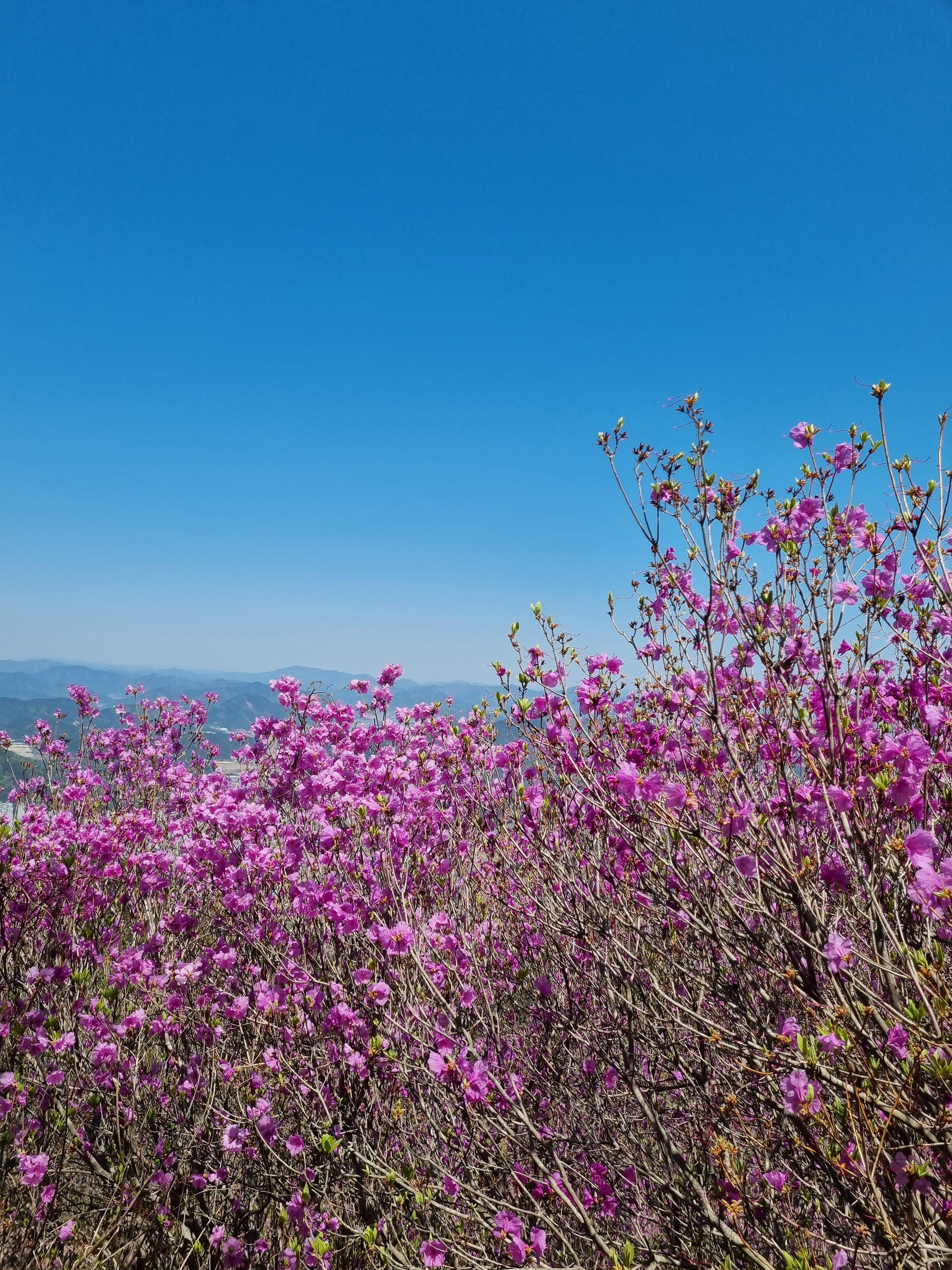 진달래 군락이 산을 덮고 있어 진달래 특유의 보랏빛을 띠고 있었습니다.
