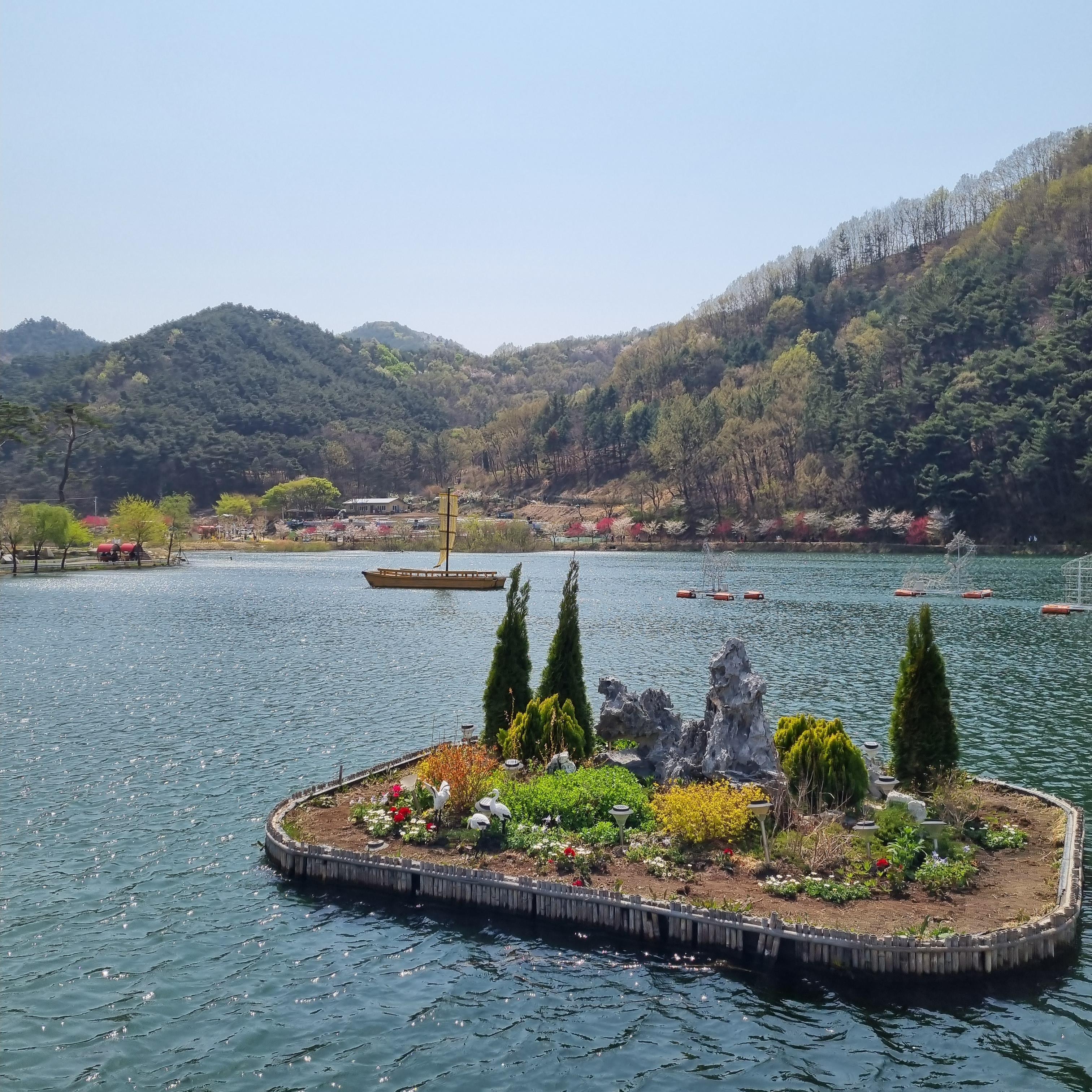 저 멀리 호수 한가운데 있는 정자가 눈에 띕니다.