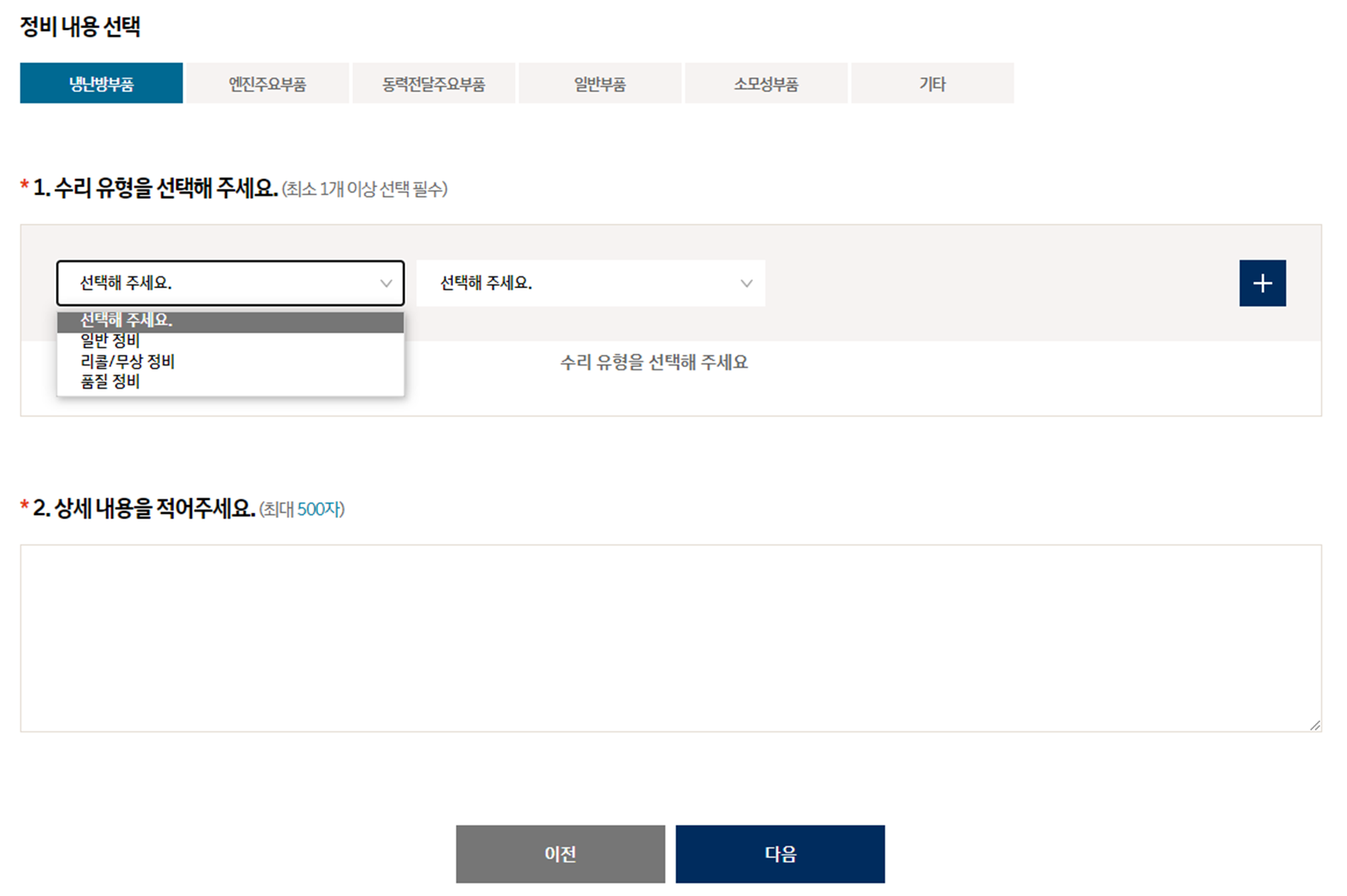 4. 정비받을 부품 및 수리유형 선택 후 정비받을 내용을 기입한다.