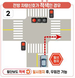 교차로에서 전방 차량신호가 적색이고 전방 횡단보도 신호가 녹색이면 무조건 일시정지를 해야 합니다. 일시정지 후 보행자가 없으면 우회전이 가능합니다.