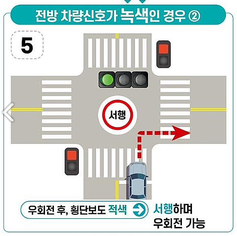 교차로에서 전방 신호가 녹색이고 우회전하는 보행자 신호가 녹색인 경우 일시정지 후 우회전을 해야 합니다. 많은 운전자분들이 놓치고 있는 부분이 일시정지를 하더라도 우회전시 횡단보도 위에 보행자가 있으면 절대로 우회전을 하시면 안 됩니다. 즉 보행자가 완전히 건너고 나서 우회전을 하는 것이 정상적인 우회전 방법입니다.