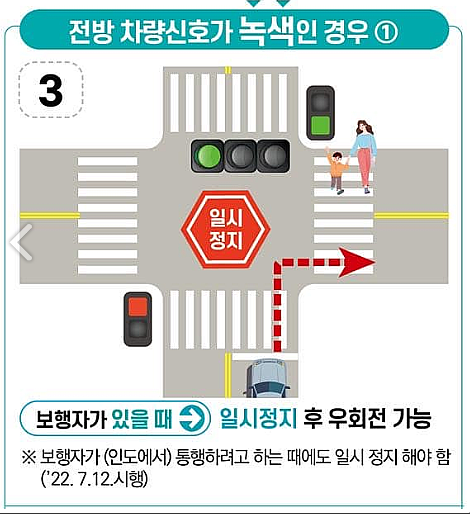 교차로에서 전방 신호가 녹색이고 우회전하는 보행자 신호가 녹색인 경우 일시정지 후 우회전을 해야 합니다. 많은 운전자분들이 놓치고 있는 부분이 일시정지를 하더라도 우회전시 횡단보도 위에 보행자가 있으면 절대로 우회전을 하시면 안 됩니다. 즉 보행자가 완전히 건너고 나서 우회전을 하는 것이 정상적인 우회전 방법입니다.