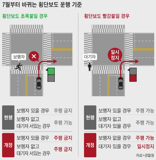 횡단보도 우회전 개정을 한마디로 정의하자면 "횡단보도 신호 색깔 상관없이, 보행자가 건너려고 할 때 무조건 정지" 해야 합니다. 과거에는 횡단보도 위에 보행자가 있는데 우회전을 하면 과태료 사항이였지만, 개정안으로는 건너려는 보행자가 있으면 무조건 일시정지를 해야합니다.
